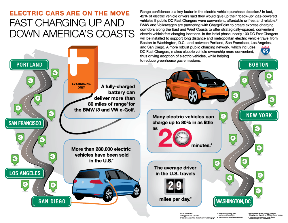 BMW, Volkswagen and ChargePoint Announce Initiative to Create Electric Vehicle Express Charging Corridors on the East and West Coasts.
