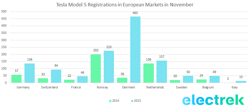 Here’s our November 2015 look at Model S deliveries based on registration data in Tesla’s most important European markets: