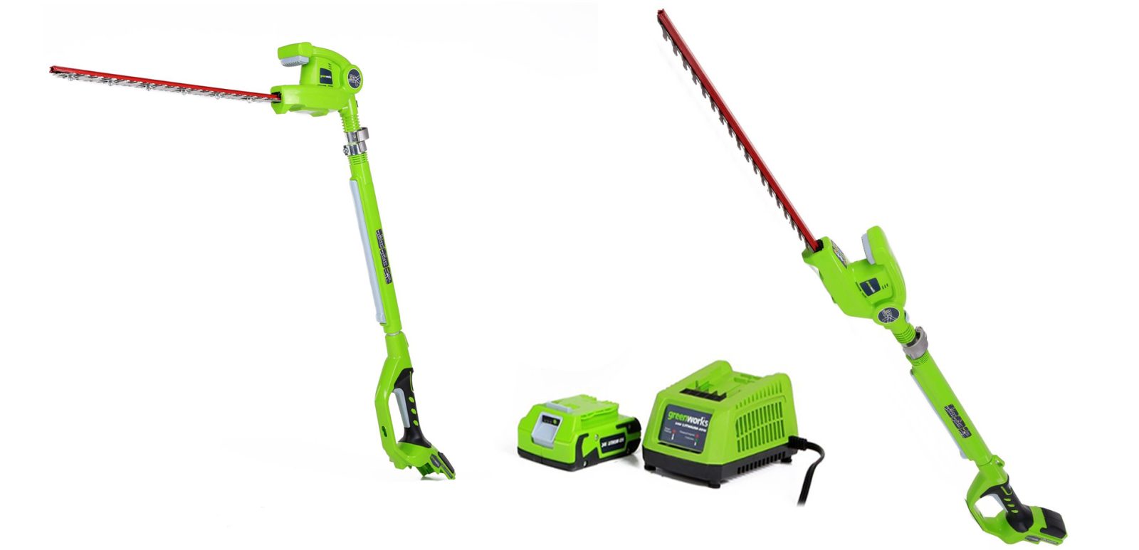 GreenWorks G-24 System offers versatility with a range of tools to choose from to get the job done with outdoor and indoor tools for all your DIY Projects. Whether it is getting the deck completed or getting your yard in pristine shape, the G-24 System has a tool for every project. From trimmers, chainsaw, pole saw and sweepers to drills, compressors and handheld circular saws, this system is quickly becoming the most versatile system for the suburban home. Compatible Battery and Charger Models include, Model 29842 and 29862. All GreenWorks Tools are backed with a 4 year warranty, the lithium-ion batteries are backed with a 2 year warranty. GreenWorks 22242 G24 Lithium-ion Cordless 20 inch Extended Reach Hedge Trimmer with 2.0AH Battery and Charger.