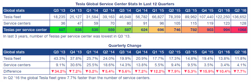 He found that by the end of last quarter, Tesla had 1068 cars in its fleet per service center or about twice as many as it had 2 years ago.