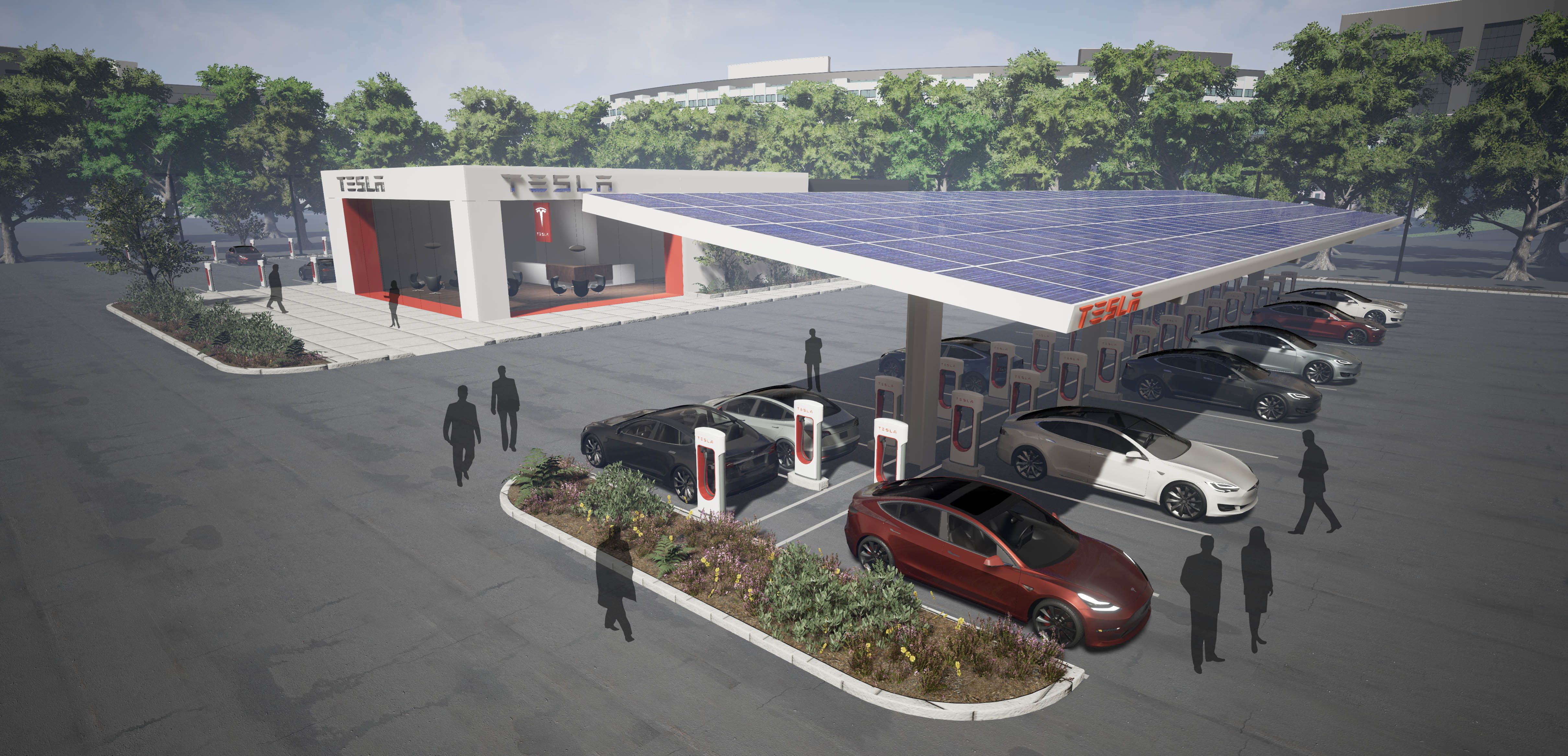 “Several dozen” chargers in a single station and Supercharging for local urban demand are new for Tesla. The featured images at the top and below are renders representing those new stations, which are supposed to be under construction shortly.