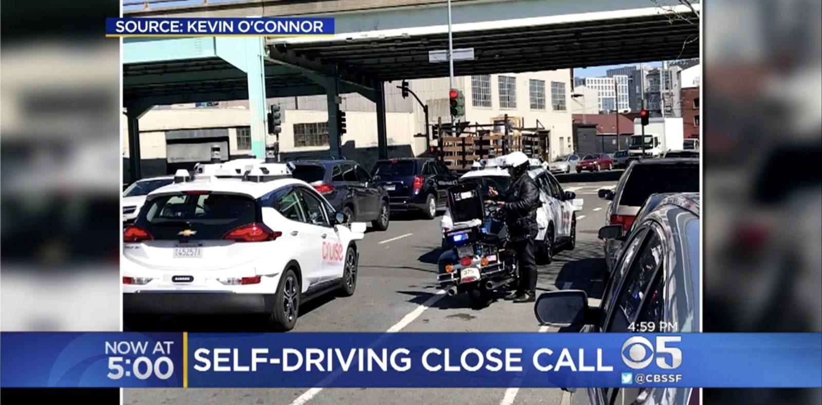 “A witness, Kevin O’Connor, snapped a photo after seeing the motorcycle officer pull over the self-driving car as O’Connor drove through the South of Market area last week. “There was another car stopped alongside and he looked a little befuddled,” said O’Connor. “The cop was just writing a regular ticket like they always do.”