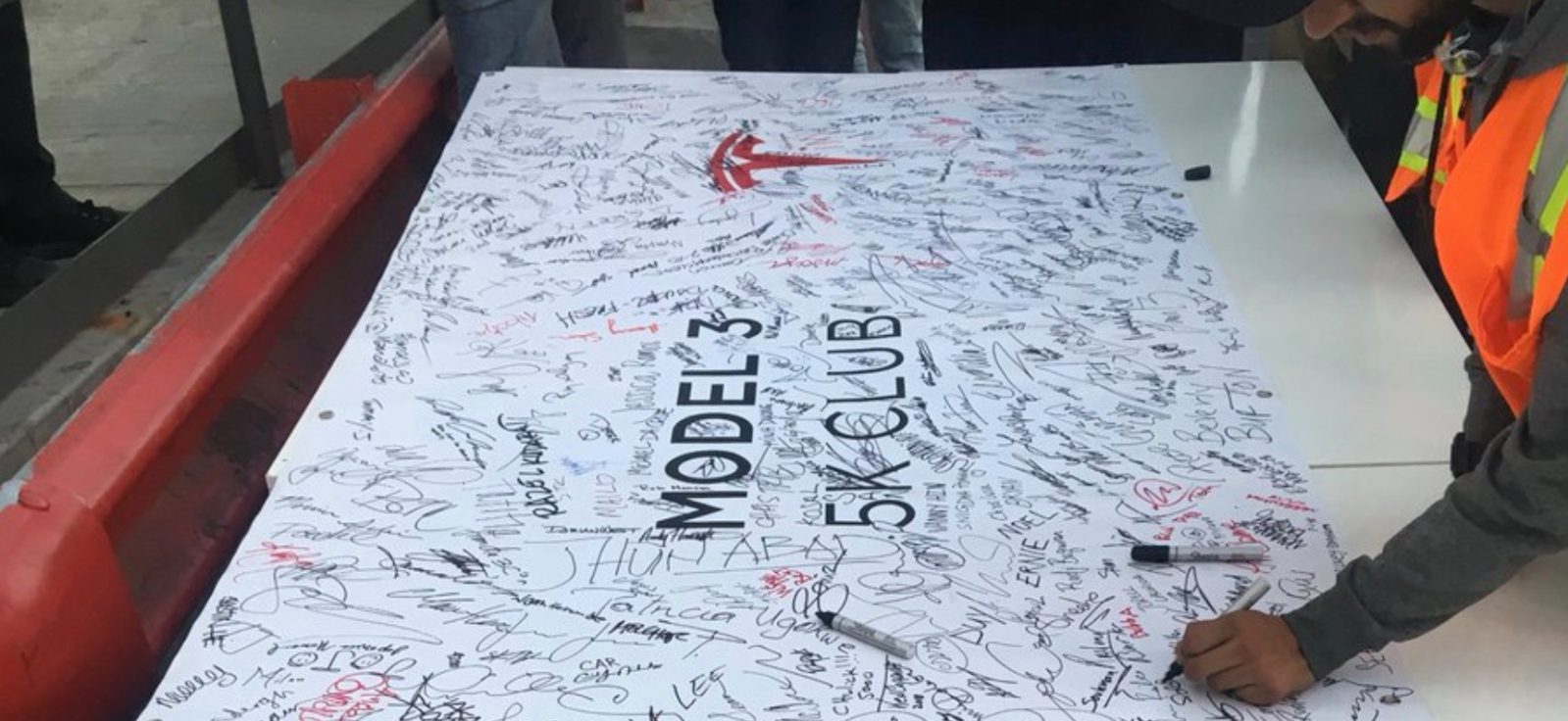Most interestingly, an employee posted an image of employees signing a poster with the mention ‘Model 3 5K Club’:
