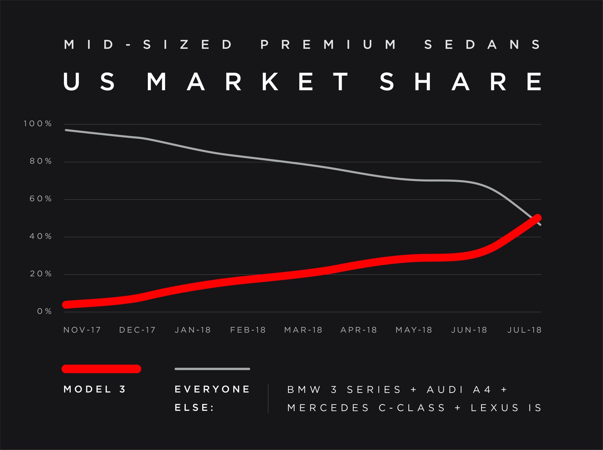 For these purposes, Tesla counts the BMW 3-series, Audi A4, Mercedes C-class, Lexus IS and Jaguar XE as “mid sized premium sedans,” and this analysis is only limited to the US, not Canada or other regions like Europe and Asia where the Model 3 is not yet being delivered.