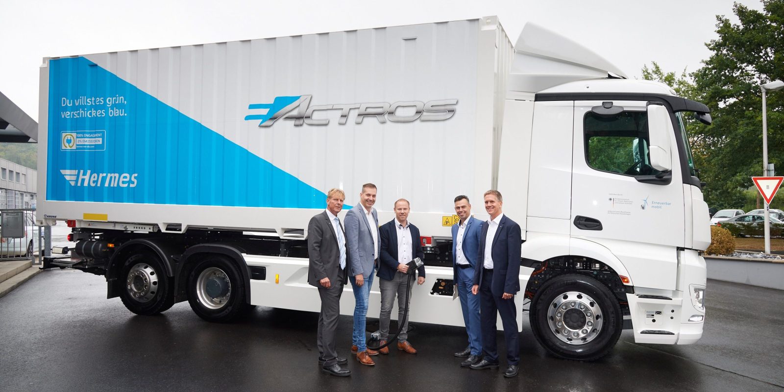 - Mercedes-Benz Trucks startet die Praxistests seines vollelektrischen schweren Lkw eActros. Der Handels- und Logistikdienstleister Hermes ist der erste von insgesamt 20 Kunden aus unterschiedlichen Branchen, die den Elektro-Lkw in ihre Flotte integrieren. Mercedes-Benz Trucks is starting practical trials for its all-electric heavy-duty eActros truck. The retail and logistics service provider Hermes is the first of 20 customers in different sectors who will integrate the electric truck into their fleets.