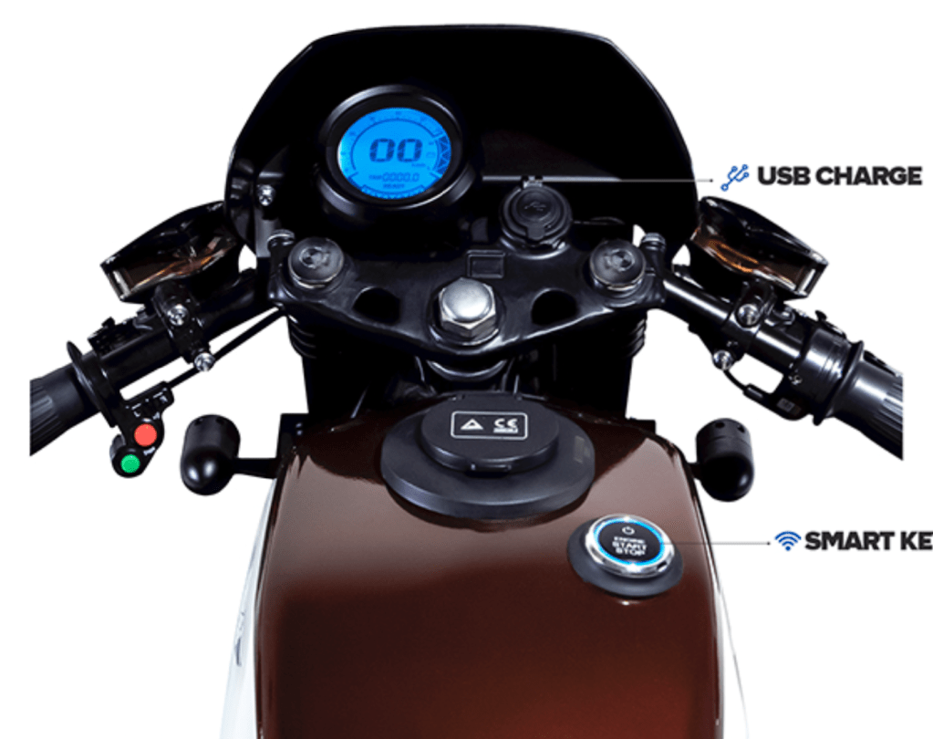 The Smart Classic features an LED display that presents the speed, battery charge, distance traveled and temperature of the motor and controller. A USB charger is included on the handlebars and a keyless on/off button is mounted just in front of the gas cap-shaped charging port.