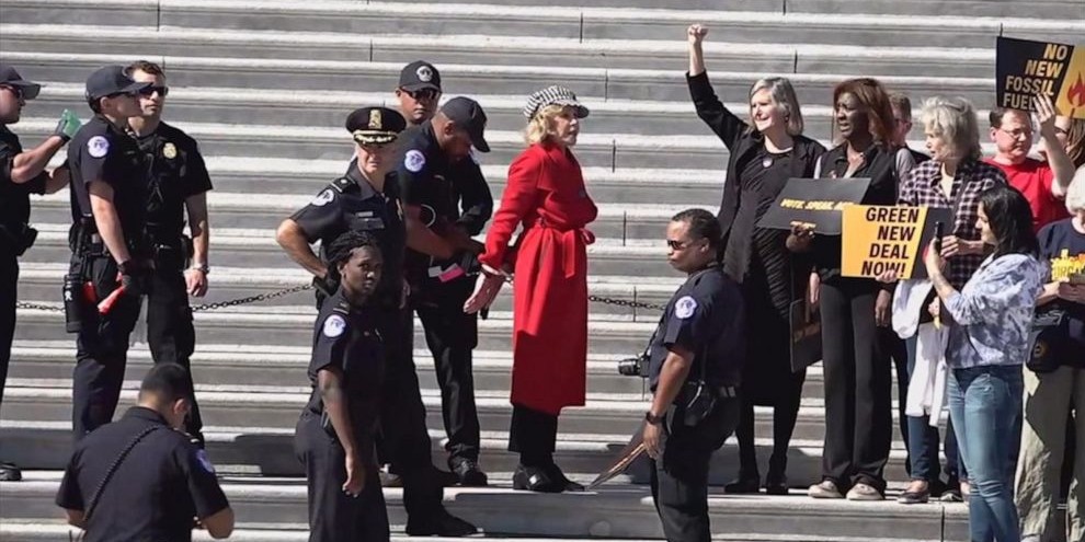 CIVIL DISOBEDIENCE: New video shows actress Jane Fonda being arrested on the steps of the U.S. Capitol during a climate change protest, with Fonda demanding urgent action on a Green New Deal and fellow protesters cheering as she was led away. https://t.co/OFdgEGuLb9 pic.twitter.com/K8bVWbbYgq