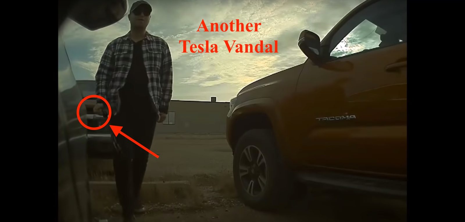 The Tesla Sentry Mode video from the side camera clearly shows the act of vandalism: