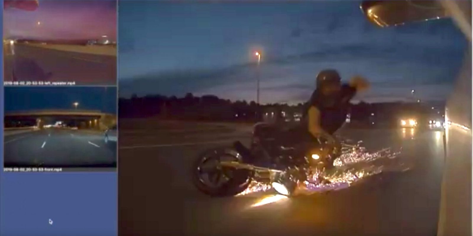 Then suddenly a motorcycle headlight appears from behind his car. The motorcycle crashes into his rear right fender and the motorcyclist goes skidding across the highway, nearly being hit by a car in the right lane. There is no footage available from the rear backup camera of the incident, as this event happened three months ago, before that update had been pushed to the fleet.