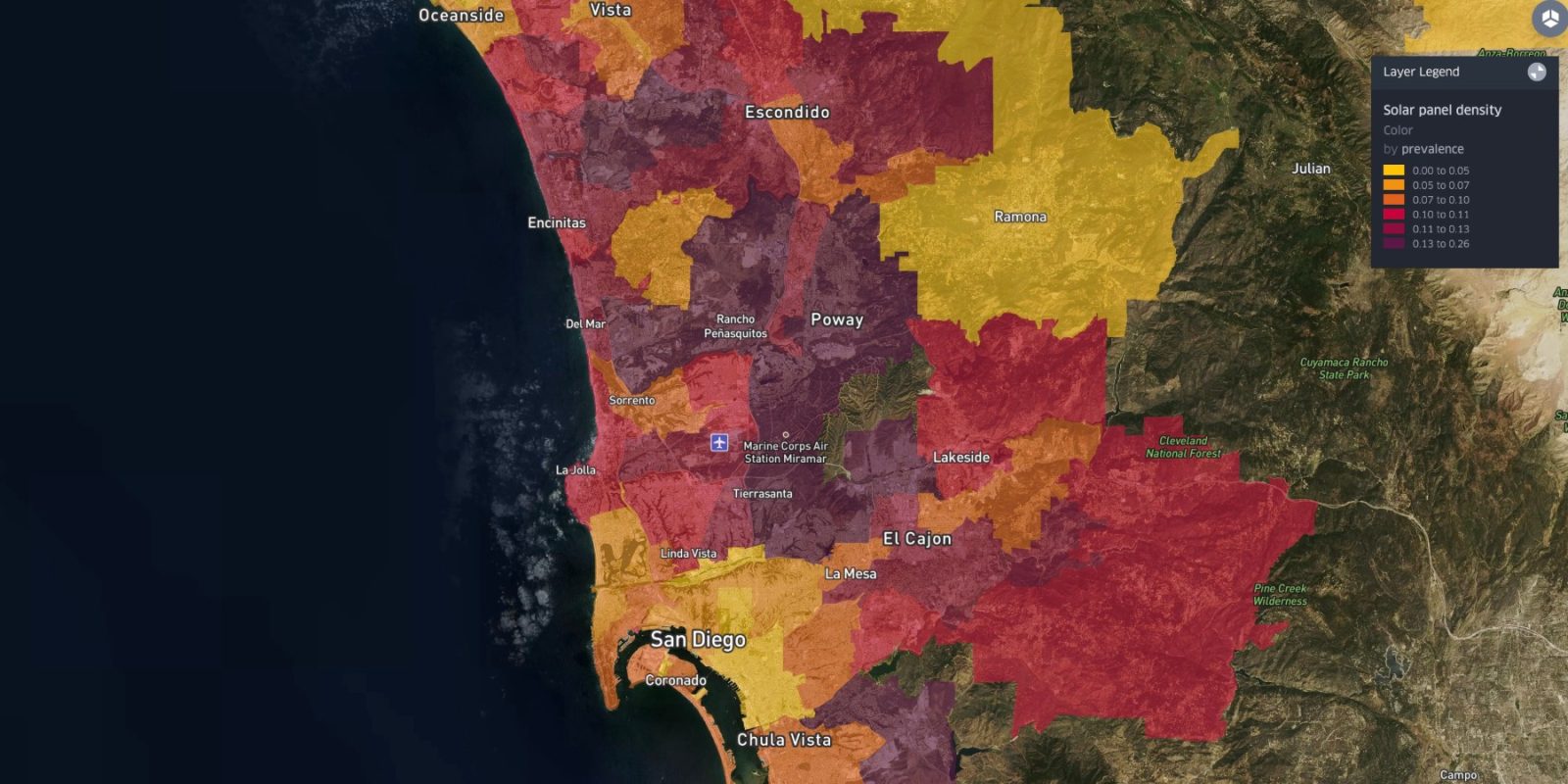 - San Diego is the most solar city, and Detroit is the least.