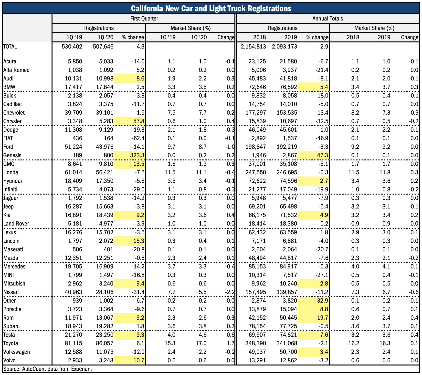 In the first three months of the year, Tesla has again grown in California, according to registration data.