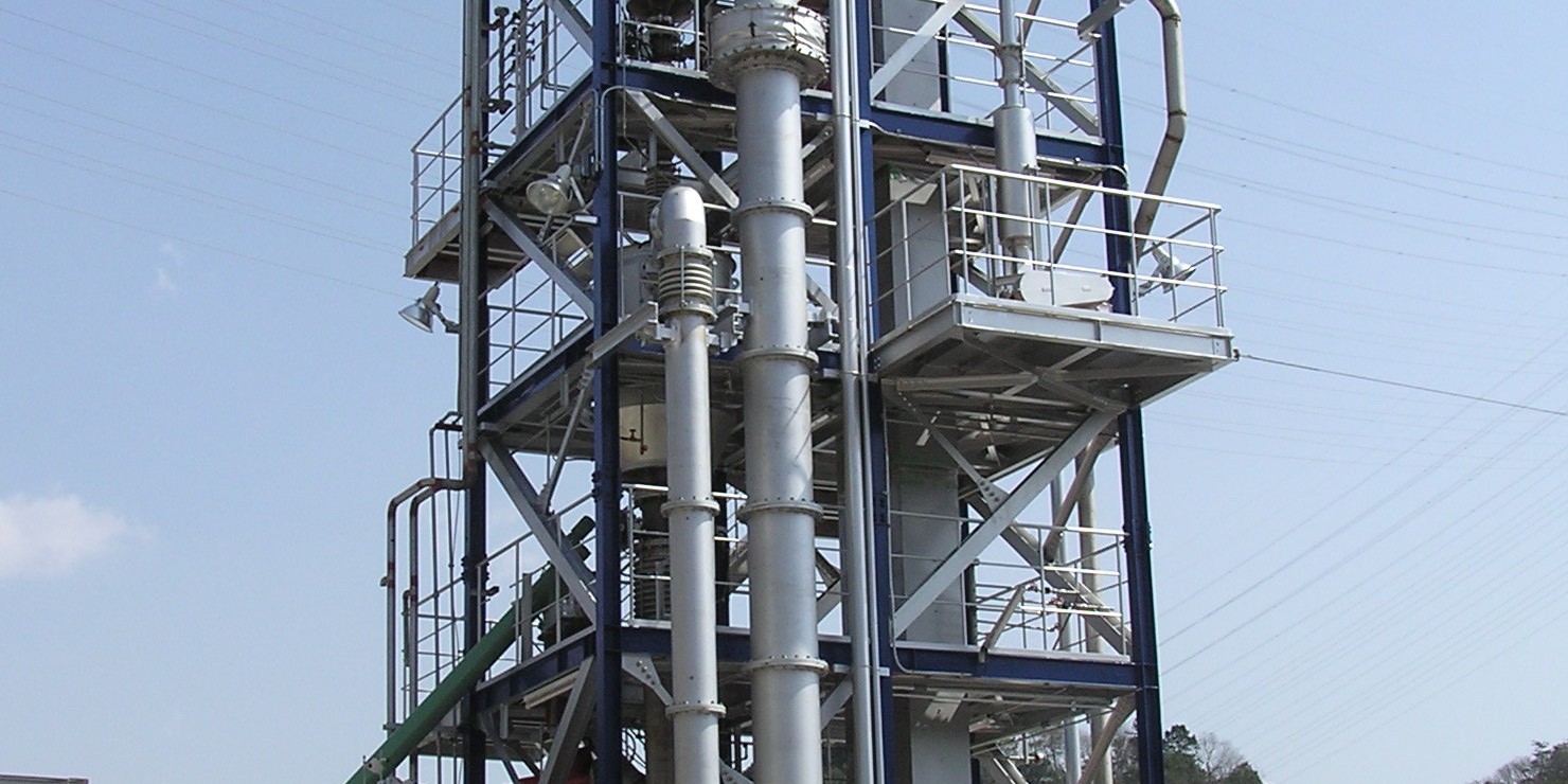 The Ways2H system is similar to the types of gasification plants that are already used to convert trash into energy around the US, but with a few key differences. First, waste is sorted to remove materials without carbon or hydrogen (think glass and metal), dried, and shredded into one-inch pieces. Then it is fed into a vaporization chamber that heats it to over 1,000 degrees Fahrenheit to produce syngas — a mixture of hydrogen, methane, and carbon dioxide — that can be used as fuel or further refined. The Ways2H system increases the hydrogen concentration in the syngas by mixing it with steam, which creates a mixture that is about half hydrogen and half carbon dioxide. The hydrogen is then filtered out using a commercial pressure-swing absorption system, a tank filled with absorbent materials that soak up the carbon dioxide like a sponge. The entire system sits in an open air tower that is about seven stories tall [pictured above].