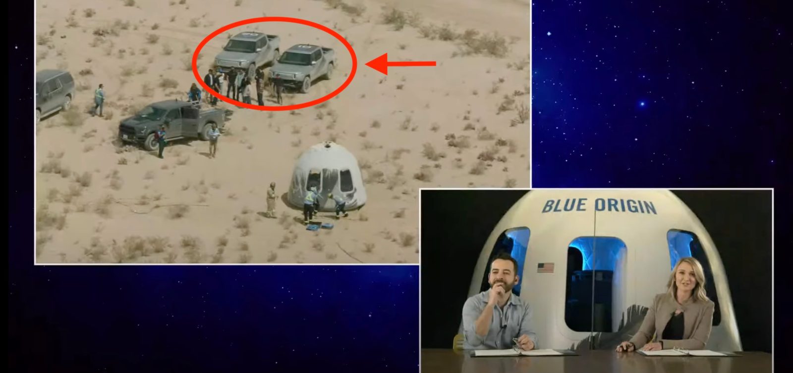 After the capsule landed (2:10:00), several vehicles converged at the scene and two of them are R1T electric pickups numbered 09 and 10 on top.