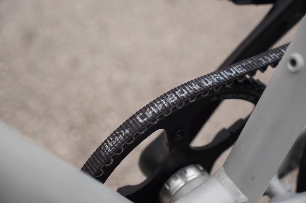 Of course the motor isn’t really an internally geared hub – and thus there aren’t any gears at all on this e-bike. But the trade-off for not being able to shift is that you’re gifted this awesome Gates carbon drive system. It replaces a conventional bicycle chain and makes for a smoother, quieter, and maintenance-free ride. These last for tens of thousands of miles – way longer than chains – and never need oiling or adjusting.