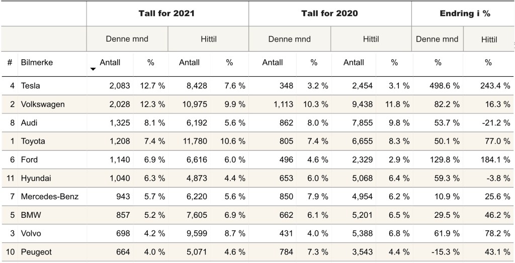 | Passenger cars | Number in August 2021 | Market share in August 2021 | Market share in August 2020 | Market share so far in 2021 | Market share same period in 2020 |