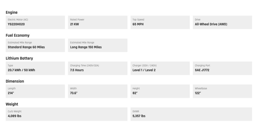 According to the Kandi website, the K32 will come available in two versions, both equipped with dual-motor, all-wheel-drive capabilities. The Standard Range K32 will offer 60 miles of estimated range from a 20.7 kWh battery, while the Long Range UTV promises up to 150 miles of range from a 50 kWh battery. Check out the rest of the specs below: