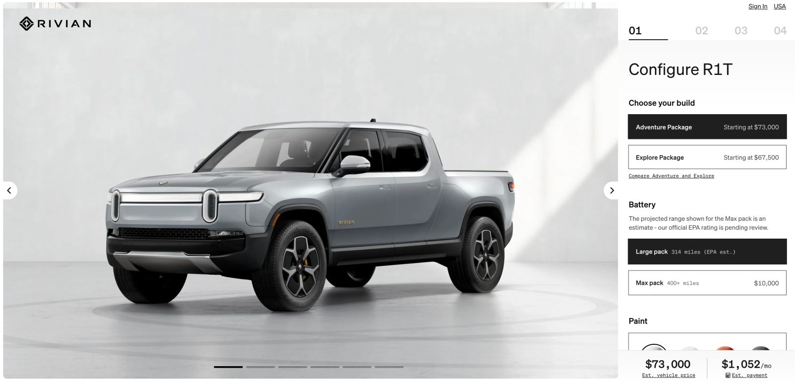 Rivian is currently delivering the R1T electric pickup truck with its “Large” battery pack, which gets 314 miles of range based on the EPA cycle.