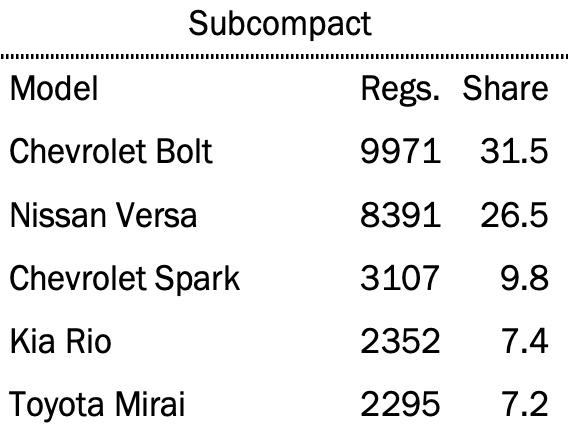 Interestingly, even GM’s Chevy Bolt EV, which had a tough year due to a battery recall and sales being halted for most of the second half of the year, dominated the subcompact segment: