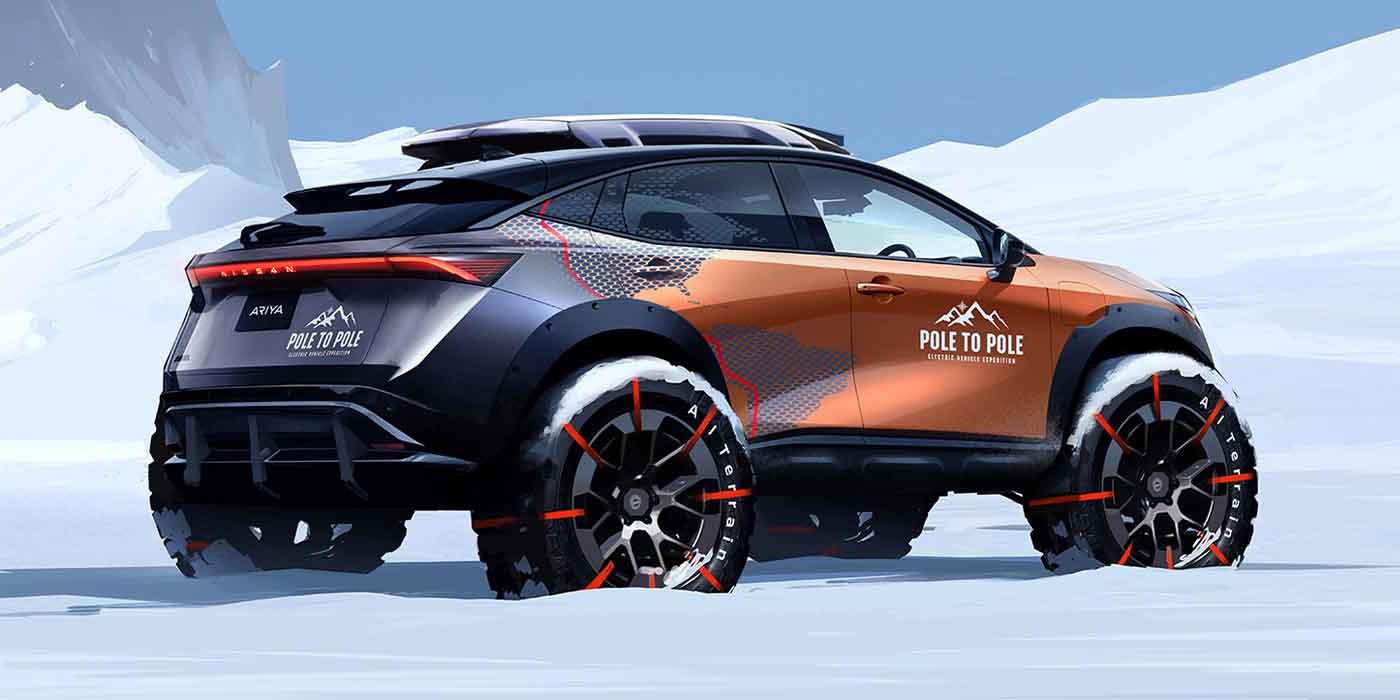 In anticipation of the harsh freezing conditions of the Arctic and Antarctic, the Pole to Pole trip will be undertaken by a modified Nissan Ariya e-4ORCE that will include a custom bolstered exterior to handle the extreme terrain as well as upgraded wheels, tires, and suspension. A second unmodified Nissan Ariya e-4ORCE will also be present as a support vehicle during the trip through the Americas.