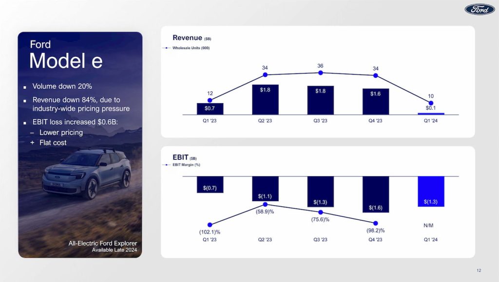 Meanwhile, Ford Model e revenue slipped 84% due to “industry-wide” pricing pressure. With lower prices, the unit’s EBIT loss increased YOY to $1.3 billion. That’s an over $100,000 loss for every EV sold in Q1. However, this is still down from the $1.6 billion EBIT loss in Q4 2023.