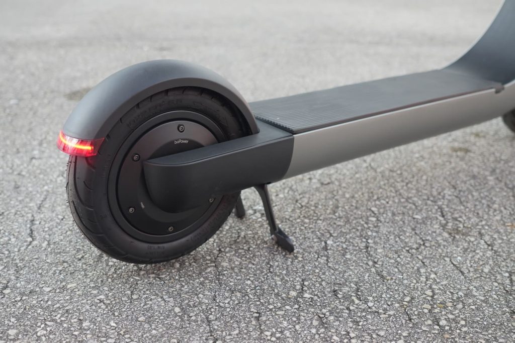 Bo takes a slightly different approach to braking than most scooters. Up front, you get a sealed mechanical drum brake. Out back, there’s a regenerative electronic brakes with e-ABS that activates when you pull the left lever. The regenerative braking can pull as much as 1,000W of power, helping to (briefly) recharge the battery during each stop.