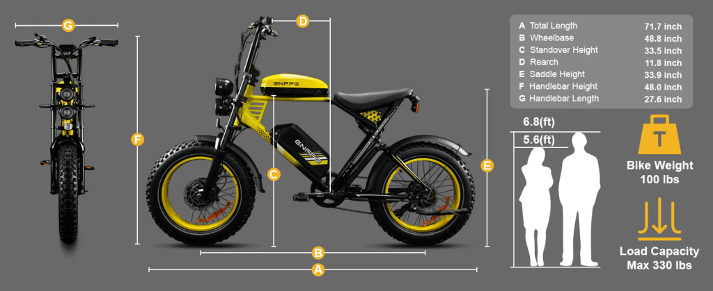 - 20×4-inch wheels and knobby tires.