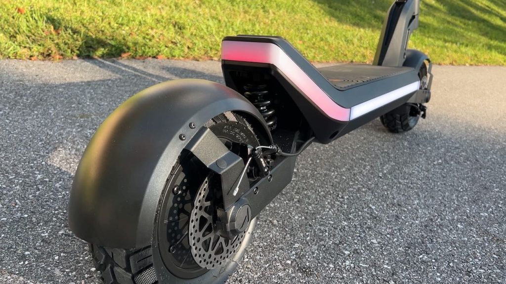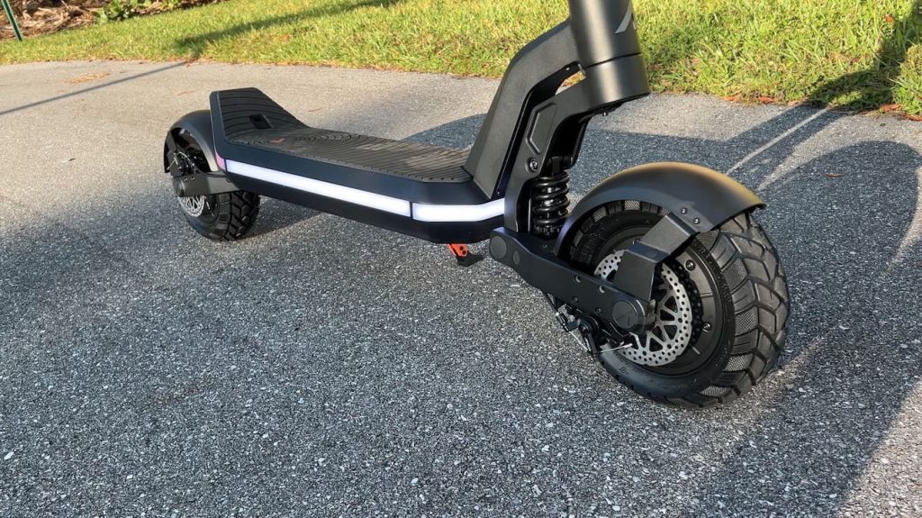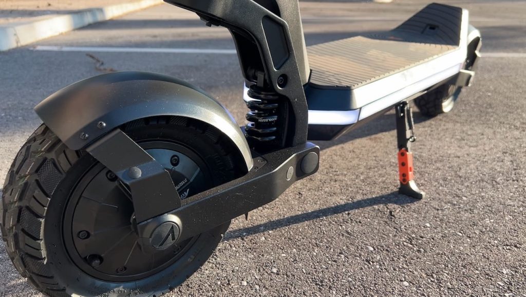 The suspension does a genuinely good job of soaking up road imperfections. Cracks, rough pavement, and uneven surfaces are handled smoothly, making longer rides far more comfortable than you might expect from something this performance-focused. Even real bumps, like those from pot holes, aren’t as bad as you might expect. Even so, there’s only so much that 11-inch tires can take, so don’t go bombing right through the center of any open manholes. But for a modest pothole, you’ll find that the suspension does a pretty good job of smoothing things out, at least with respect to scooters.
