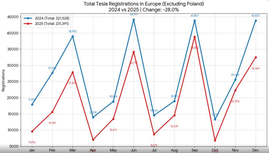 According to registration data compiled from major European markets, Tesla saw its total volume drop from roughly 326,000 units in 2024 to just over 235,000 in 2025. That is a staggering 27.8% year-over-year decline.