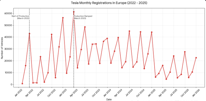 If you look at the sales chart, Tesla has a massive problem. They have a factory capable of pumping out 375,000+ Model Ys a year in a market that only bought ~235,000 Teslas total in 2025 (including Model 3s imported from China and a handful of Model S/X from the US).