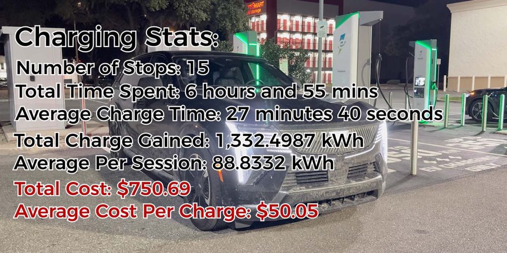 In total, we made 15 charging stops, adding 7 hours of extra travel time across 4 days of driving. Our average charge time was under 28 minutes, and we averaged 88.8 kWh per session. The total charging cost was $750, which is definitely higher than the cost of a trip in a combustion Escalade. Still, as I said, I chose to stop a lot more often than needed to ensure we were nowhere close to 0%—also, zero emissions—Yayyyyy.