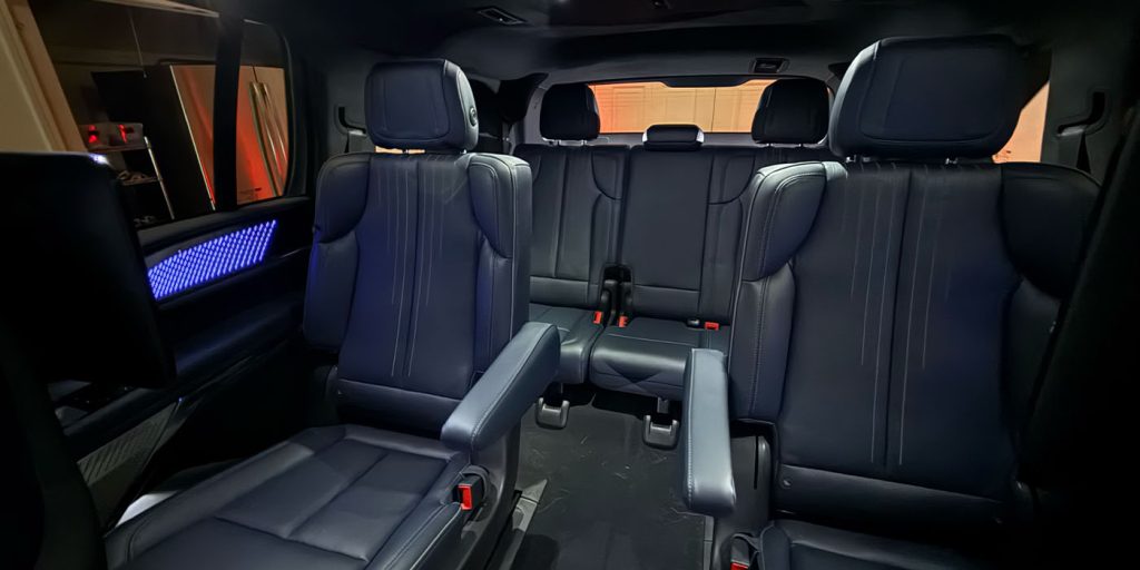Second-row passengers have their own display panel where they can control the rear doors, adjust HVAC, and activate heated seats for the second and third rows. Below that display are 2 USB-C ports, 2 HDMI ports, and a 110V plug. That means you can hook up a DVD player, or better yet, a gaming console. 10-year-old me would be so beyond jealous.