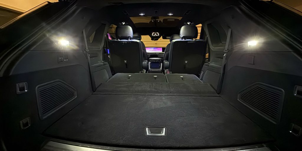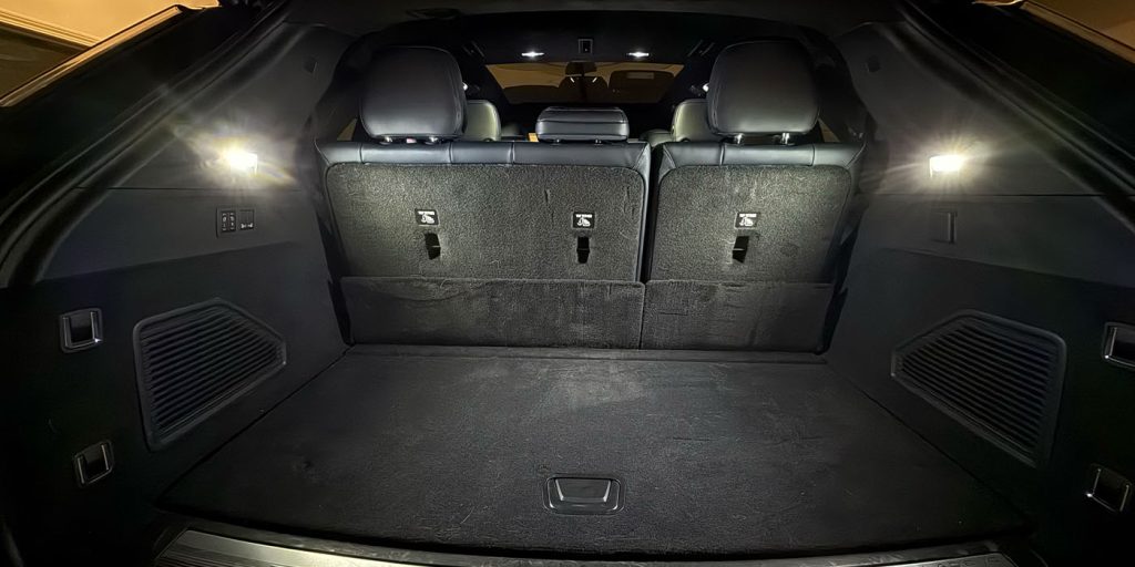 You wouldn’t notice it at first, but I soon learned that you can tap the rear Cadillac logo to open the trunk, which offers a respectable amount of space even with the third row up (see cargo specs above).