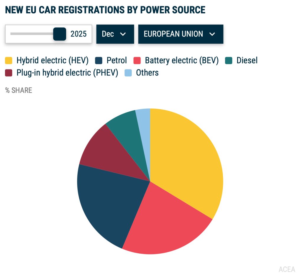 Over the full year in the EU, BEVs made up 17.4% of sales and petrol-only cars made up 26.6%, so the year ended much stronger for EVs than it started.