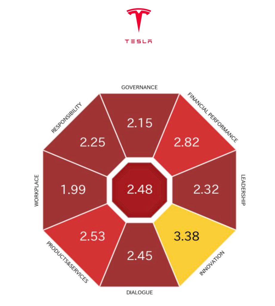 On the eight areas surveyed, Tesla tended to do best in innovation, followed by financial performance and products & services. It fared worst in the areas related to governance, working conditions and corporate responsibility.