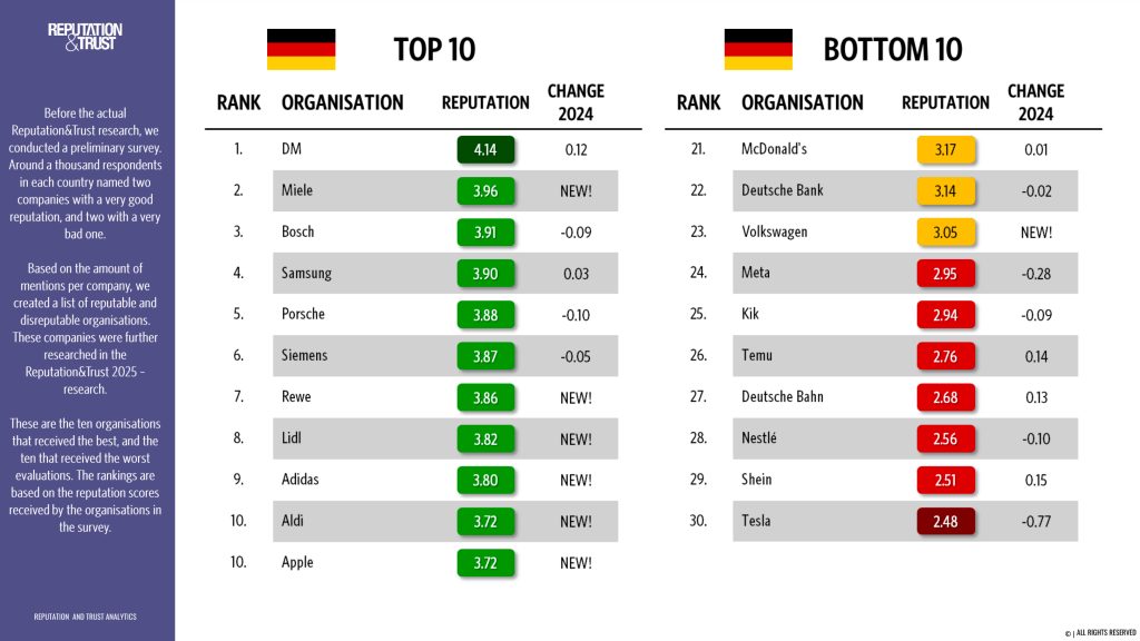 The “Reputation&Trust 2025” study, by Finnish company Reputation and Trust Analytics, ranks Tesla in absolute last place out of 30 surveyed companies in Germany, with a reputation score of 2.48 on a scale of 1 to 5. Any score under 2.5 is considered “very bad.”