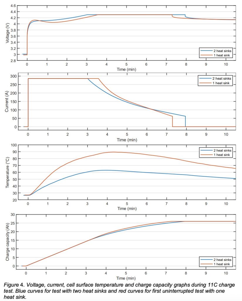 At 11C with two heat sinks, the cell reached 80% state of charge in 4.5 minutes, with the surface temperature climbing from 26.5°C to a peak of 63°C. At 5C with a single heat sink, the cell charged fully with temperatures rising from 27°C to 61.5°C. At 5C with two heat sinks, the peak temperature was only 47°C from a starting point of 23.4°C.