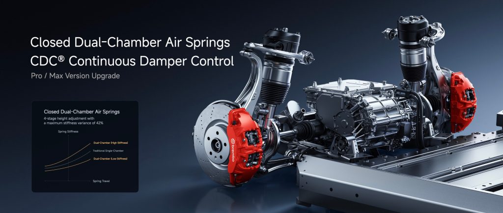 The chassis gets significant attention. The Pro model now inherits the dual-chamber air suspension with Continuous Damping Control (CDC) that was previously exclusive to the Max trim. All models get wider staggered tires — 245 mm front, 265 mm rear — and four-piston fixed front brake calipers. The Max variant upgrades further to Brembo calipers with drilled, vented discs.