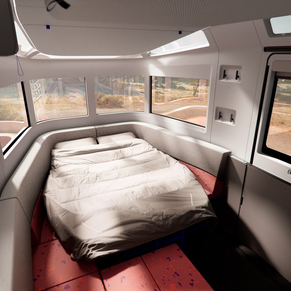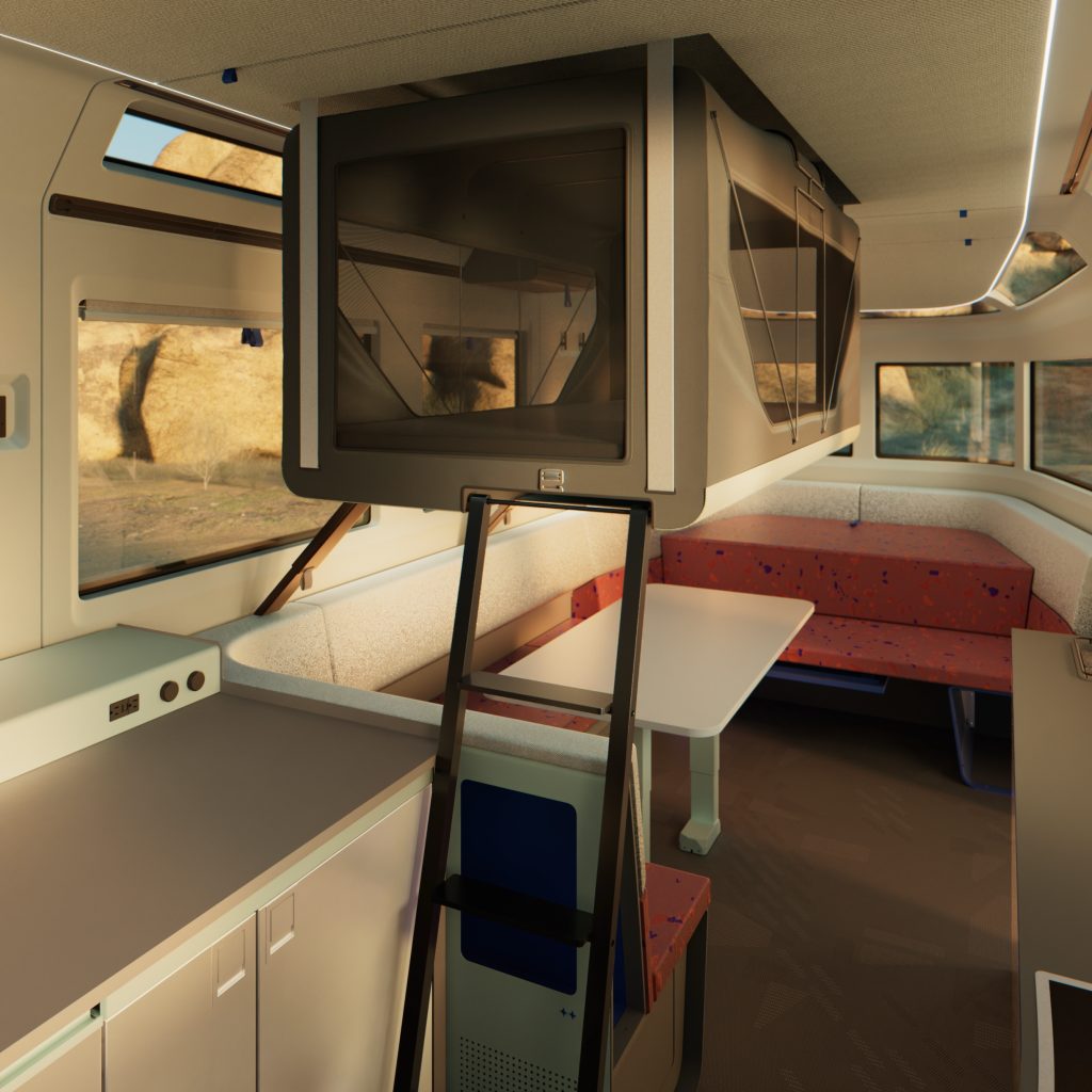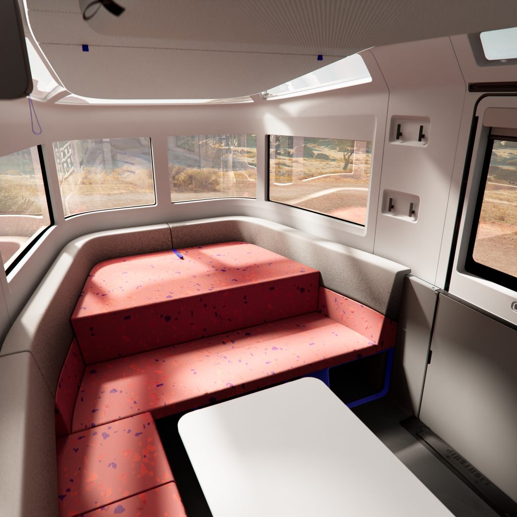 The table in the center sits four, and lowers down – electrically, of course – allowing the daybed and seating area to fold out into a sleeping area that Lightship says can sleep 4, or 5 with an optional bunk bed that drops down from the ceiling (we weren’t able to see the 4-person configuration, though… it does seem like it could be a little tight).