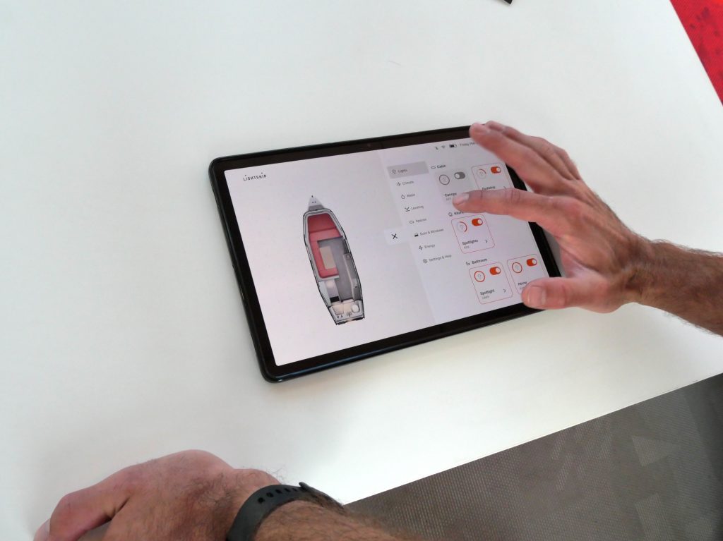Everything in the trailer is controlled through a companion app, which you can get to through your own phone or an included tablet device that tucks into a slot near the door.