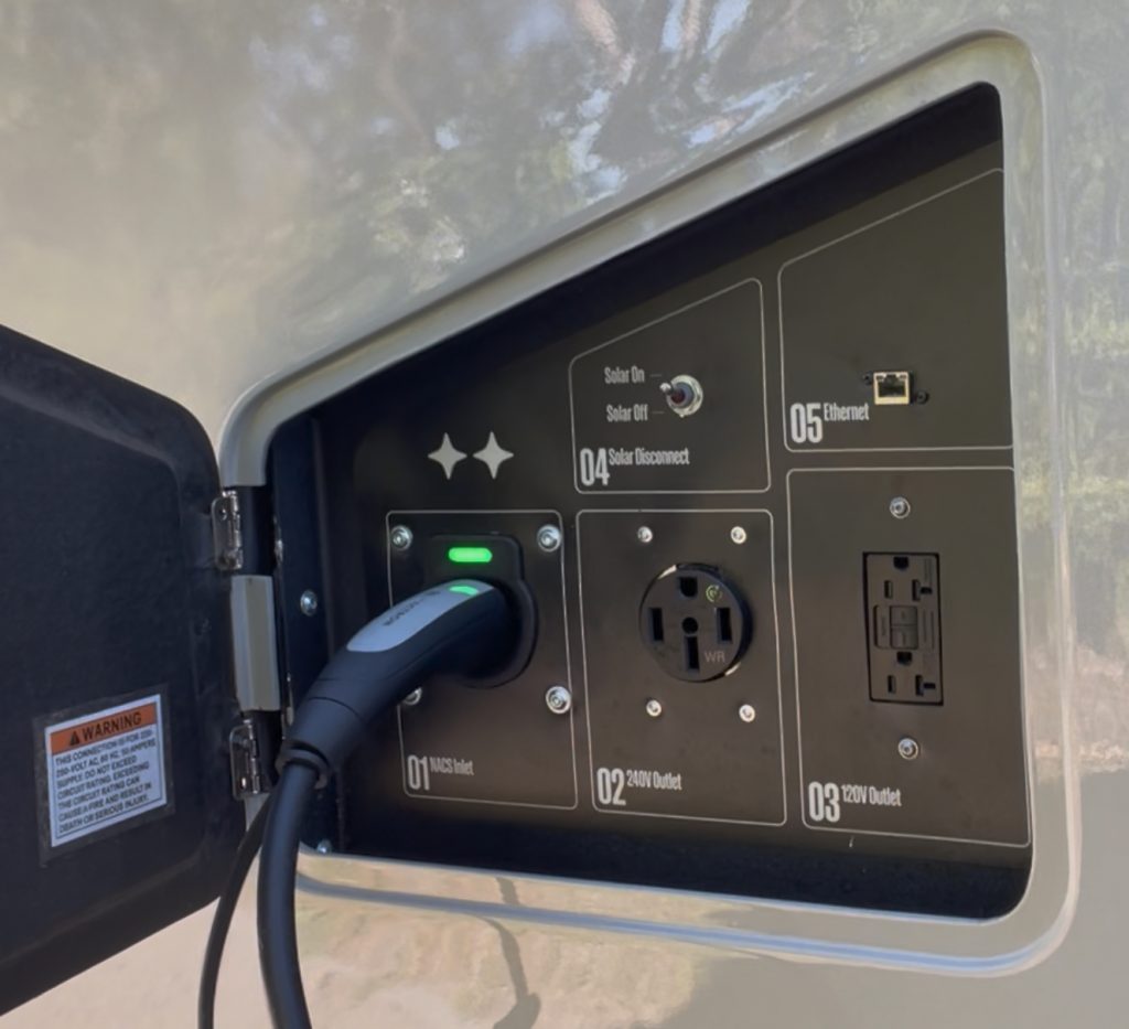 If you have access to electricity, as most RV campgrounds do, you can just plug into an RV hookup and use this to charge your battery at up to 9kW (assuming a 50A hookup – 30A will charge slower). You can even discharge the battery through a 240V outlet and charge your EV from the RV at up to 9kW.