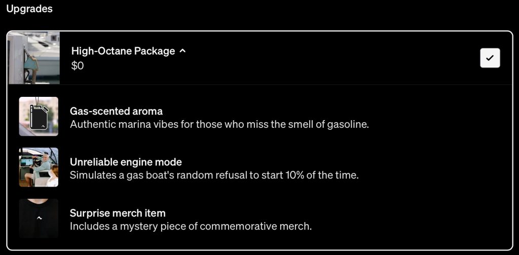 So, how better to make all those points than to offer an optional package to make your boat worse, just to remind you of the bad old days of having to burn millions-year-old dino juice to get around.