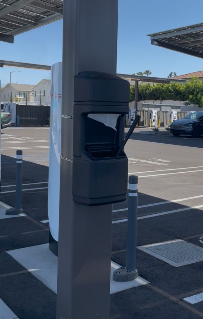 And it even has some of those necessary small things that you never see at EV chargers but are very useful for any place a car stops – squeegees for window cleaning, and trash cans.