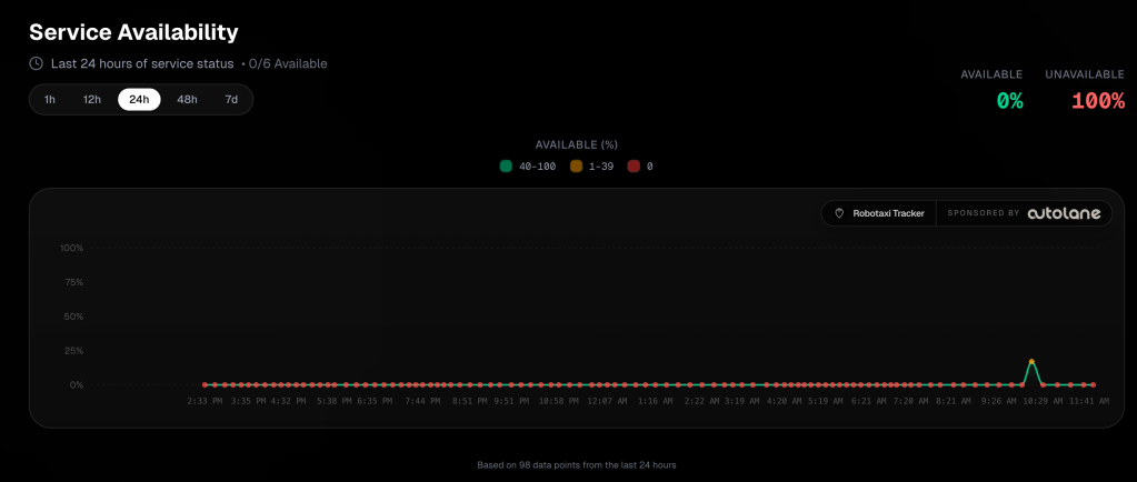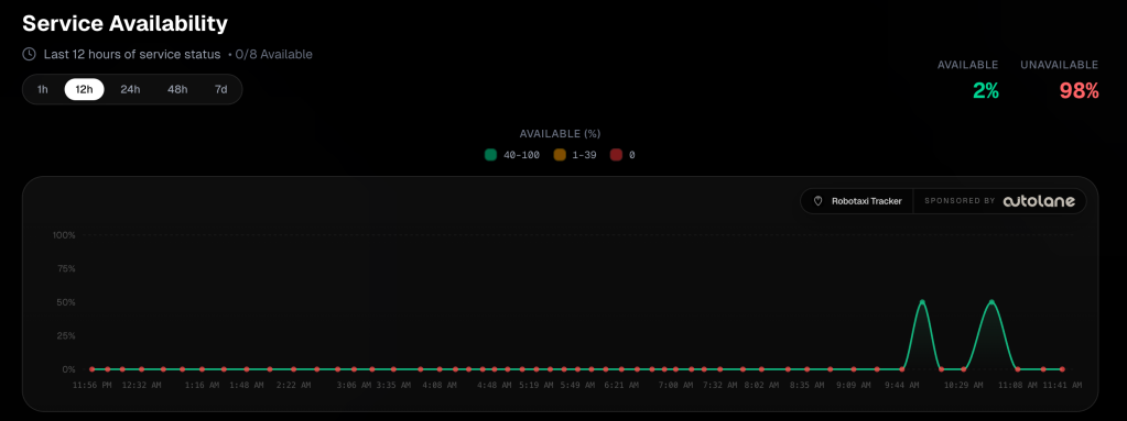 Data from Robotaxi Tracker shows that Tesla’s new Houston and Dallas deployments have had 0% to 2% availability over the past 24 hours, with only brief spikes to around 50% during a narrow morning window before dropping back to zero. It looks like Tesla deployed a car or two in each city and called it a launch.
