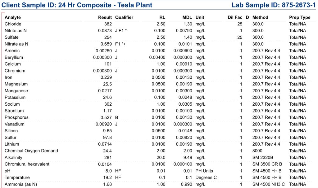 Hexavalent chromium measured at 0.0104 mg/L — just above the lab’s reporting limit of 0.01 mg/L. While trace-level, hexavalent chromium is classified as a known human carcinogen by the National Toxicology Program and is the same substance made infamous by the Erin Brockovich case. Arsenic was detected at 0.0025 mg/L, below the federal drinking water standard of 0.01 mg/L but still present. Neither substance appears in Tesla’s TCEQ-issued wastewater discharge permit.