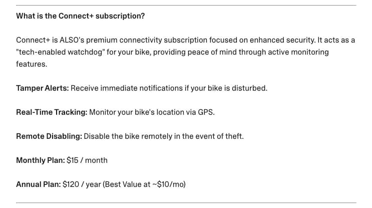 ALSO highlights a number of connectivity and security features as part of its tech-forward appeal, including GPS tracking, tamper alerts, and remote disabling. But buried deeper in the company’s customer resources is the fine print: many of these features are tied to a paid Connect+ subscription priced at US $15 per month or $120 per year. In other words, some of the most compelling “smart” capabilities being used to sell the bike aren’t fully included in the purchase price.